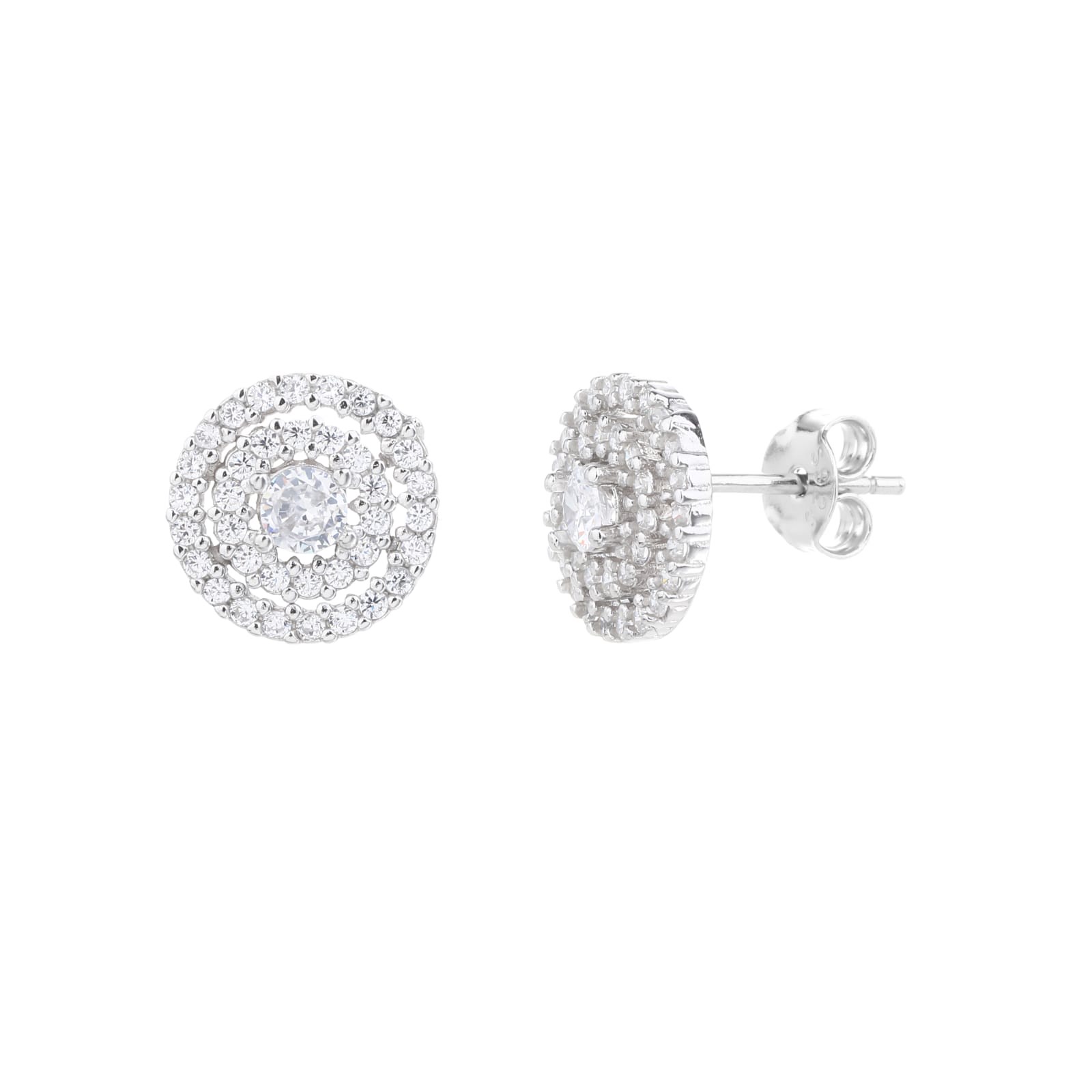حلق دائرية مذهلة، مصنوعة من فضة 925 أصلية، مع حجر مركزي متلألئ محاط بثلاث طبقات من الزركونات الصغيرة.