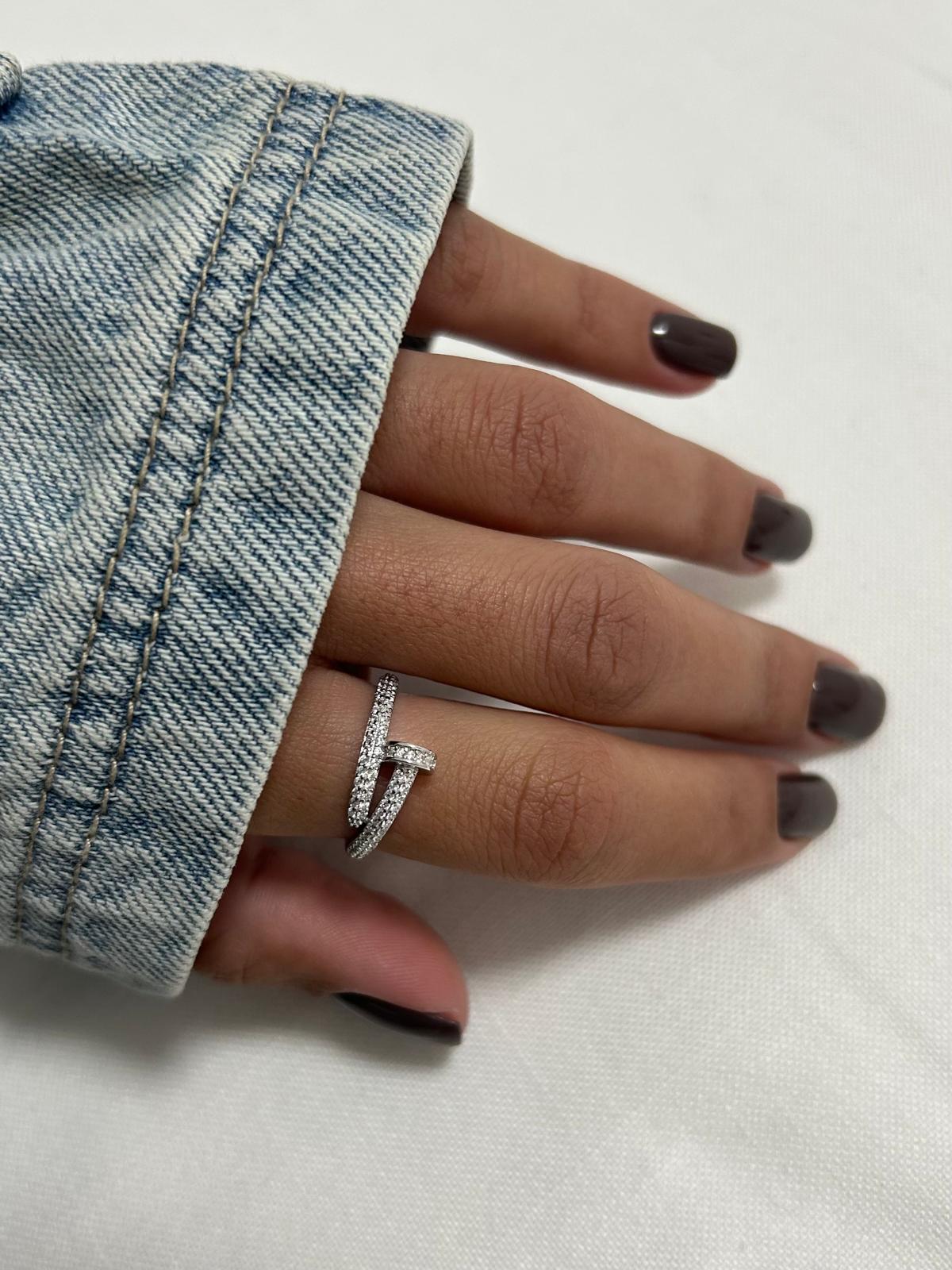 טבעת "Crossed Spark" מעוצבת בשתי זרועות מתוחות בצורת X, משובצות זרקונים קטנים לכל אורך הקווים.